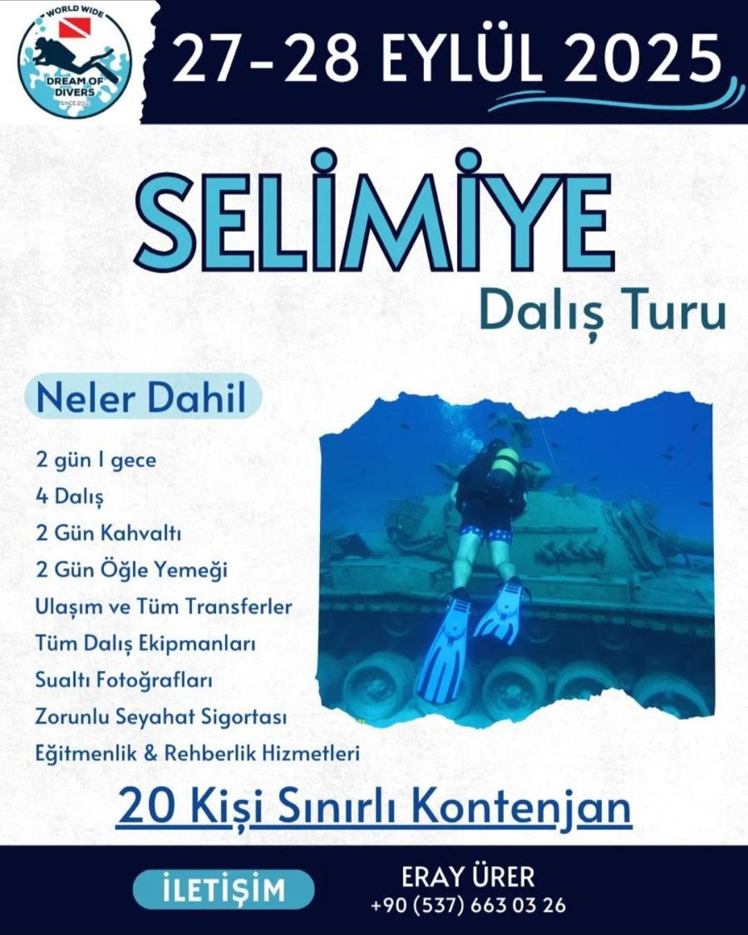 İstanbul – Selimiye Ulaşım 1 Gece Konaklama 2 Sabah Kahvaltı 2 Gün – 4 Dalış 2 Öğle Yemeği Tüm Dalış Ekipmanları İletişim Savaş Bakırtaş 0532 416 68 65